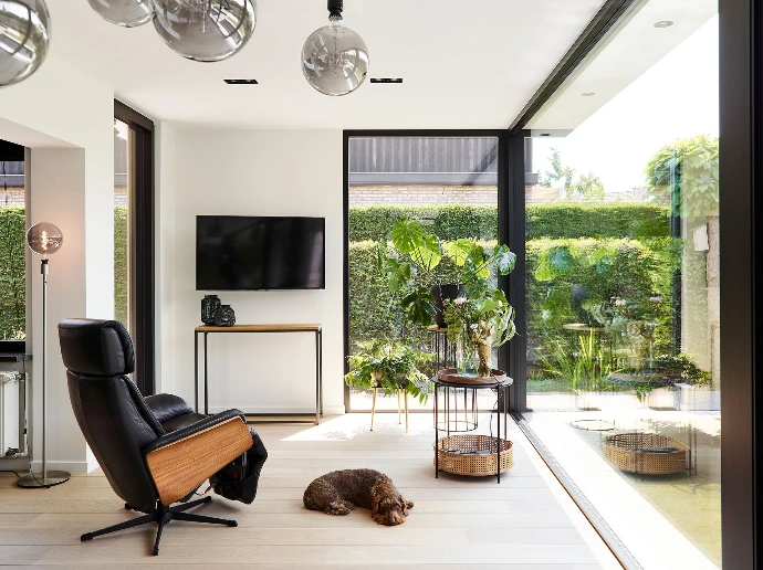De grootste troef van aluminium is ongetwijfeld de structurele sterkte. Omdat het materiaal zo stevig is, kunnen profielen heel smal blijven zonder aan stabiliteit in te boeten. Het resultaat? Een raam dat bestaat uit veel glas en weinig kader. Voor wie droomt van kamerhoge ramen, grote schuiframen of een minimalistisch lijnenspel is aluminium dé referentie. De Decalu-reeks die Skygge voert, brengt deze slankheid tot in de perfectie en creëert een naadloze overgang tussen binnen en buiten.