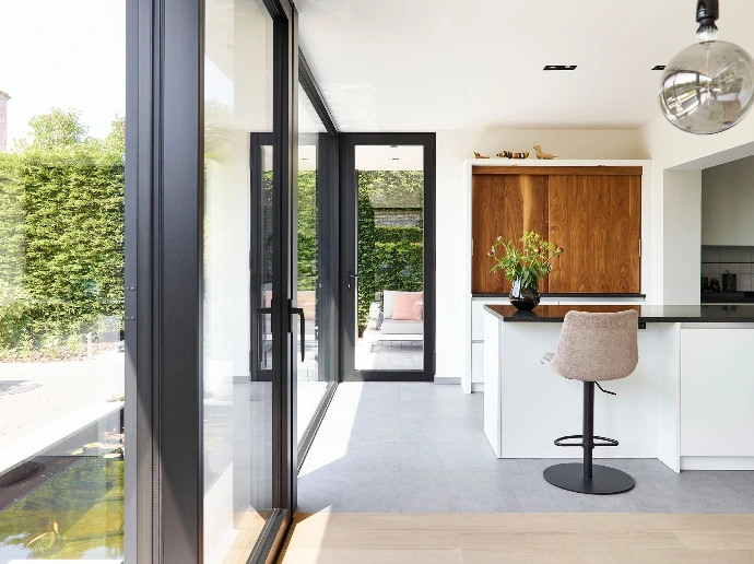 Aluminium roest niet, rot niet en vervormt niet onder invloed van vocht of UV-stralen. Het is uitermate bestand tegen de wisselende Belgische weersomstandigheden, van zomerse hittegolven tot vrieskoude winterperiodes. Een hoogwaardig aluminium raam gaat probleemloos vijftig jaar of langer mee, zonder zichtbaar te verouderen. De moderne poedercoatings van architecturale kwaliteit blijven bovendien jarenlang kleurvast, zelfs op zuid- en westgevels die intens worden blootgesteld aan de zon.